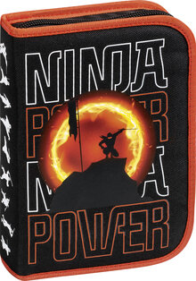 Pennfodral Ninja Power. B/H/D: 195 × 135 × 35 mm. Orange, röd, svart - antal flikar: 2 - innehåll: 9 tjocka färgpennor, 2 blyertspennor, linjal 16 cm, dubbel vässare i metall, suddgummi, pengafack, schema, ritmall.